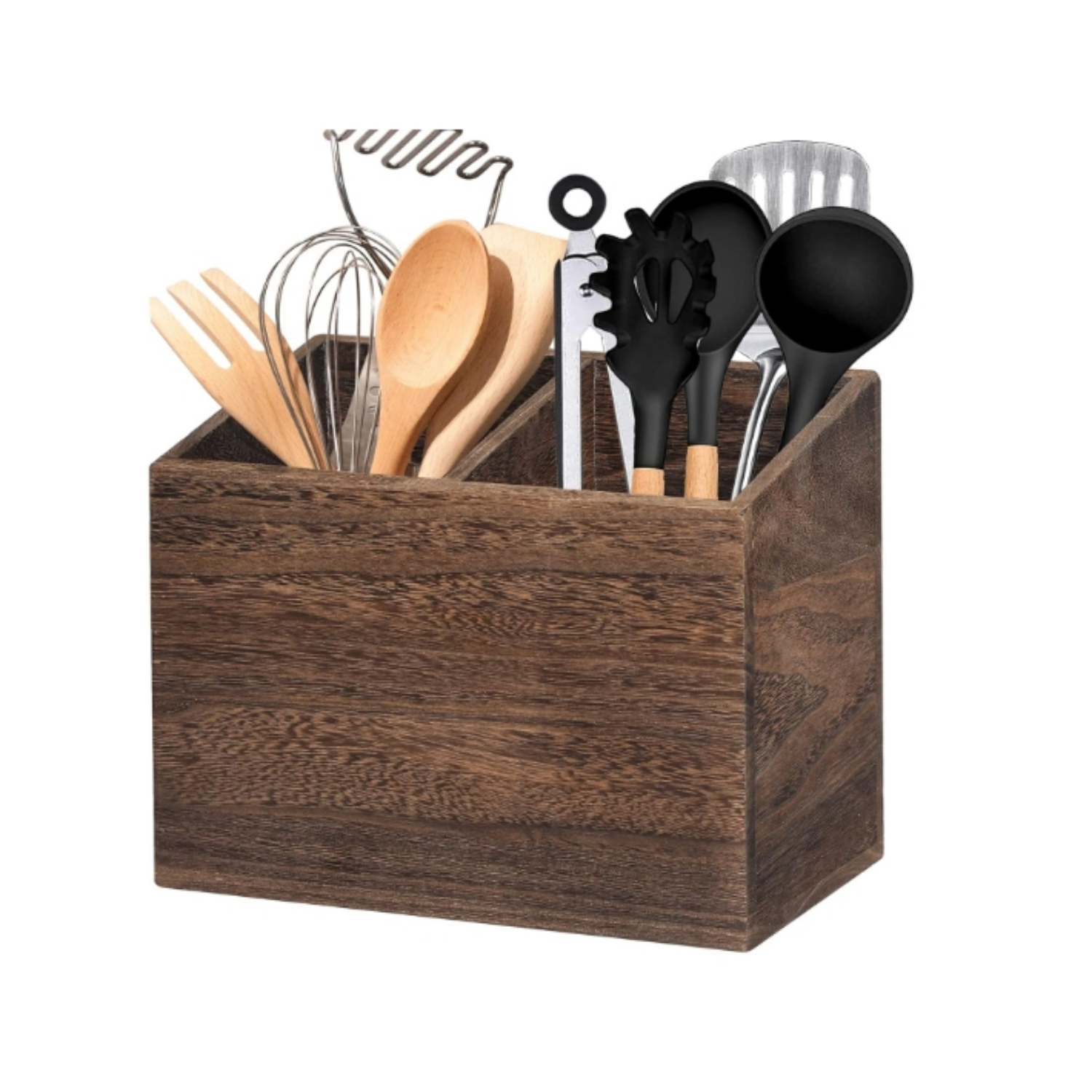 Wooden Kitchen Utensil Caddy With 2 Compartments, Rustic Kitchen Utensil Holder for Kitchen Countertop