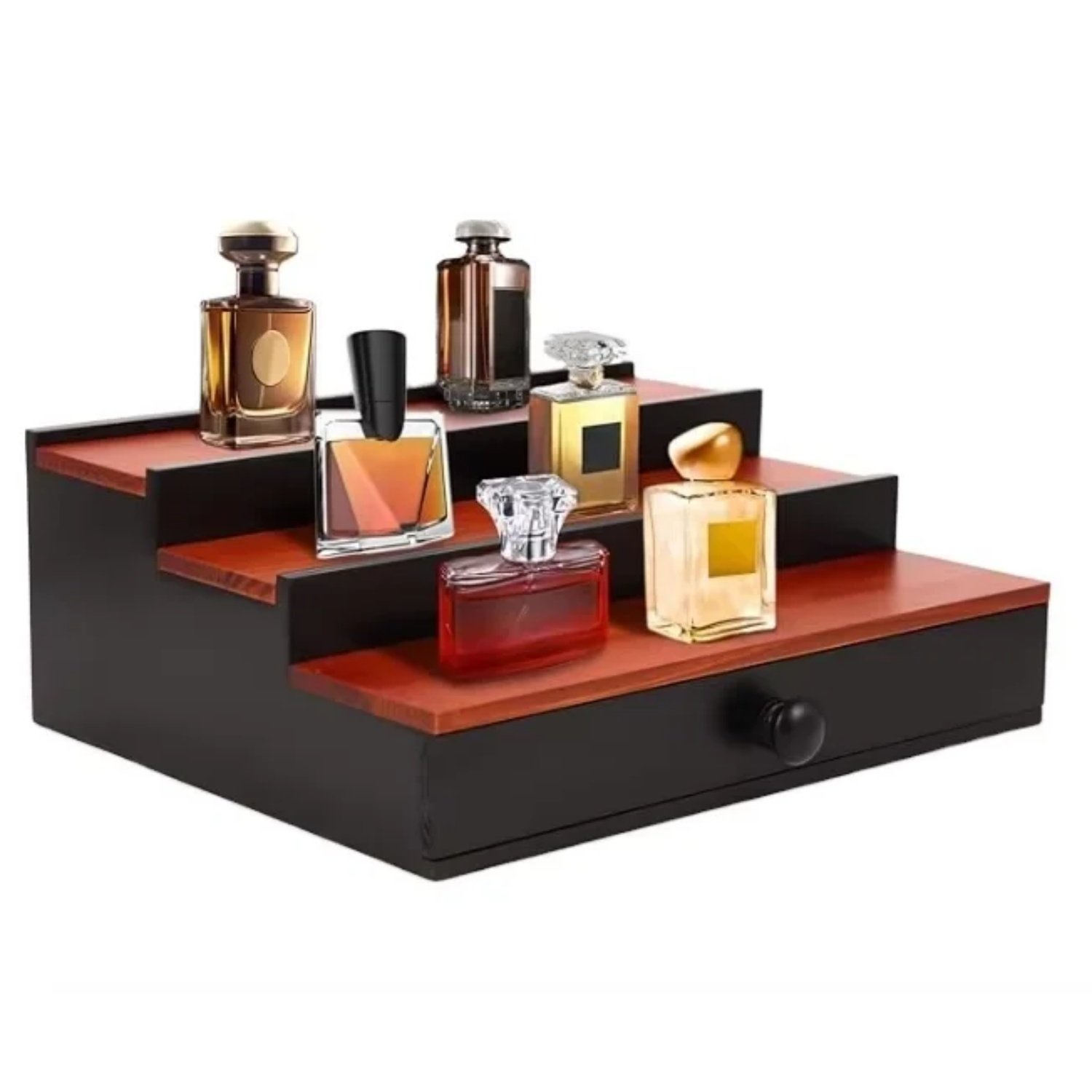 Best Selling Decolore Black Wooden Cologne Organizer for Men 3 Tier Cologne Display Shelf with Drawer