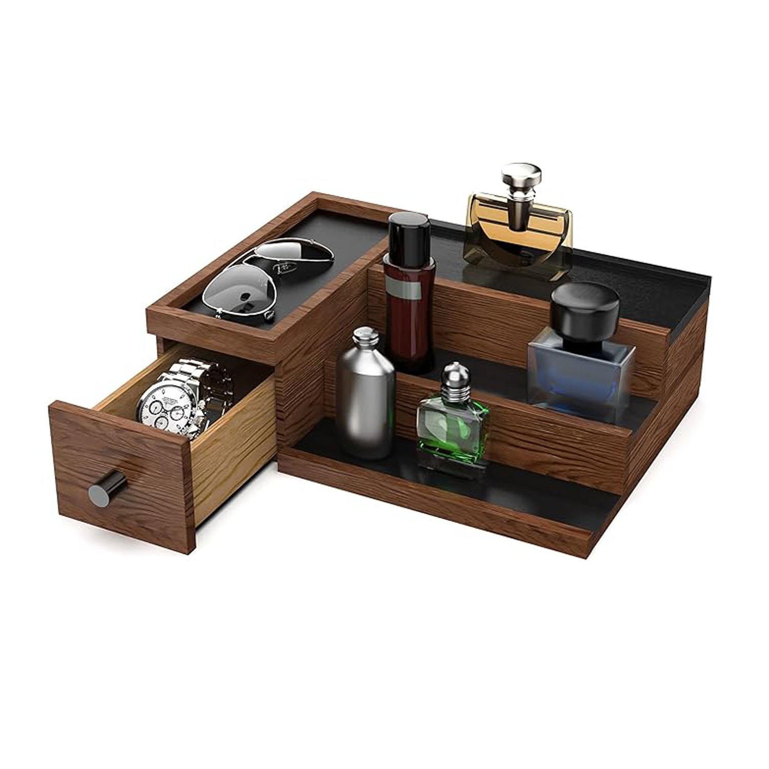 Handcrafted 3-Tier Solid Wood Cologne Organizer for Men Multi-Level Modern Gentleman’s Accessory Storage Hidden Compartments