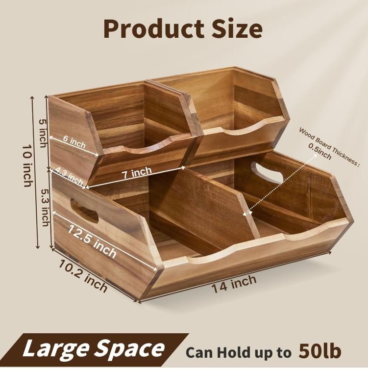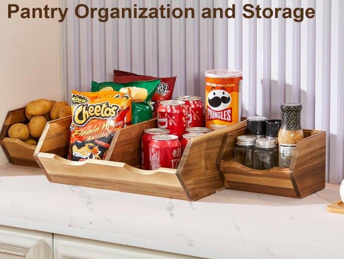 - PREMIUM ACACIA WOOD: These storage bins are made from premium acacia wood, known for its durability and natural beauty. The rich and unique wood details add a touch of nature to your kitchen, making pantry storage bins cans both beautiful and functional.The ICOHOT Premium Acacia Wood Pantry Organizer Set features a carefully curated collection of three storage bins – two compact small bins (7″ L x 6″ W x 5″ H) and one spacious large bin (14″ L x 12.5″ W x 5.3″ H), crafted to meet all your organizing needs. Perfect for storing not only potatoes and onions but also dry goods, canned foods, spices, and snack bags, this kitchen essential boasts a stackable design for optimal space management and an open-front for easy access. With no assembly required, simply unbox and start transforming your countertop into a well-organized haven. Made from premium acacia wood, these bins bring a blend of durability and natural beauty to any environment, making them suitable for use in pantries, kitchens, and living rooms alike.