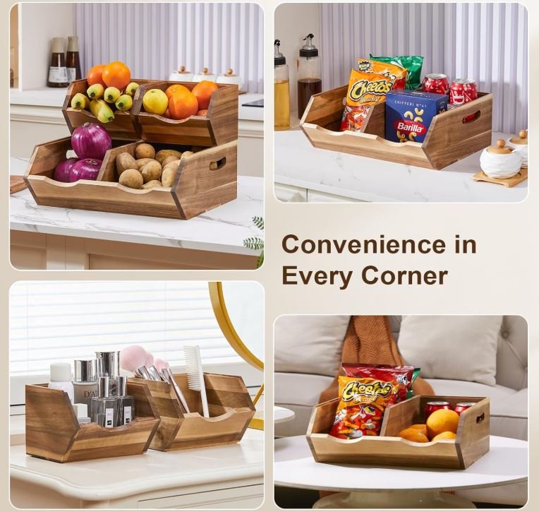 Acacia Wood Pantry Storage Bins, Stackable Storage Baskets Potato and Onion Storage Bins, Pantry Organizer Wooden Baskets Organization and Storage, Set 3 Pieces