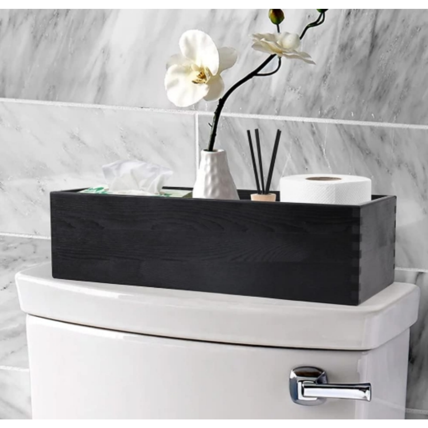 Bathroom Decor Box, 2 Pack Wooden Toilet Paper Holder, Black Toilet Tank Storage Basket