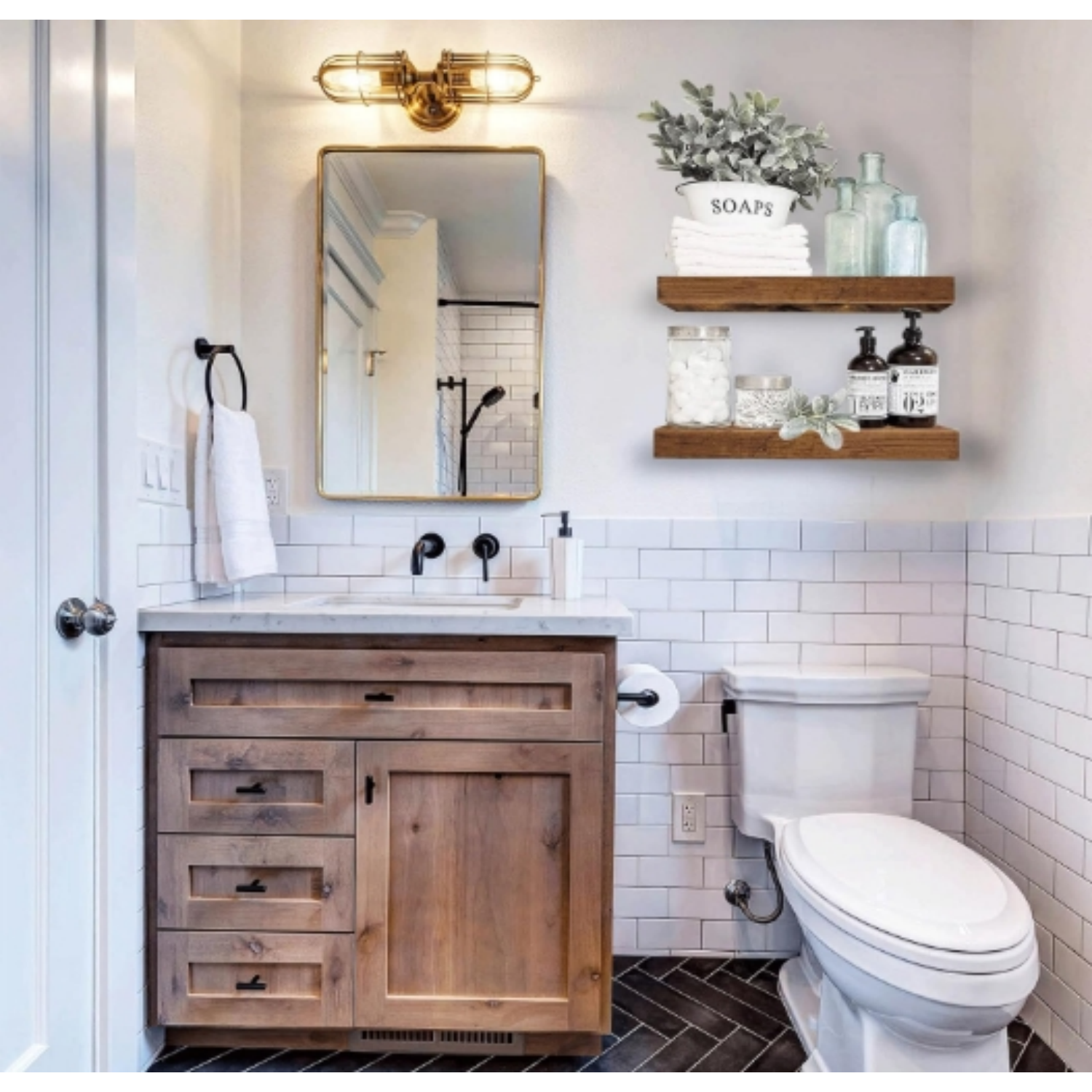 Maximize your bathroom storage with this rustic floating shelf set! Crafted from durable engineered wood with an authentic farmhouse-style finish, these shelves add both charm and function to any space.