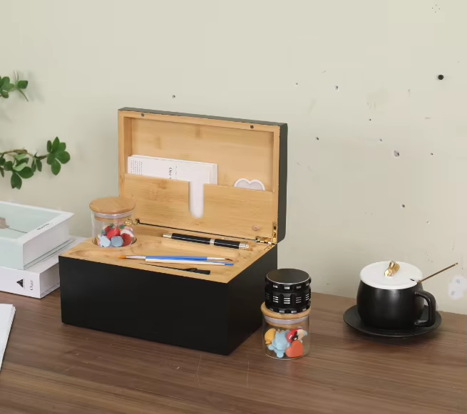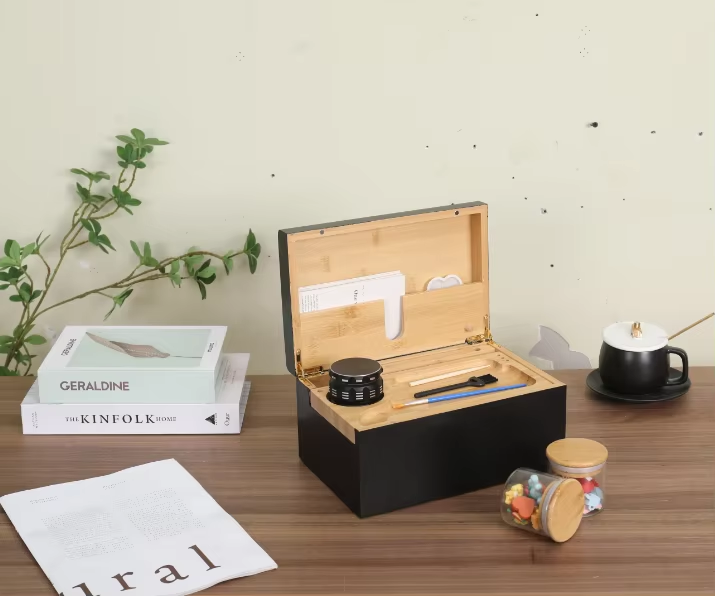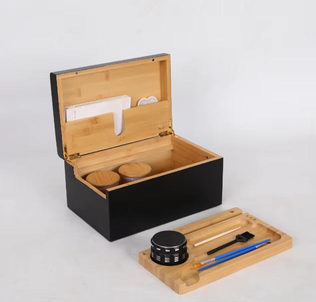 Black Grinder and Cleaning Brush Bamboo Stash Box Combo with Accessories Bamboo Decorative Storage Box with Bamboo Rolling Tray