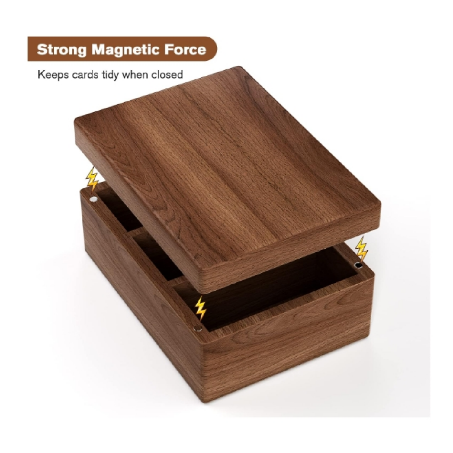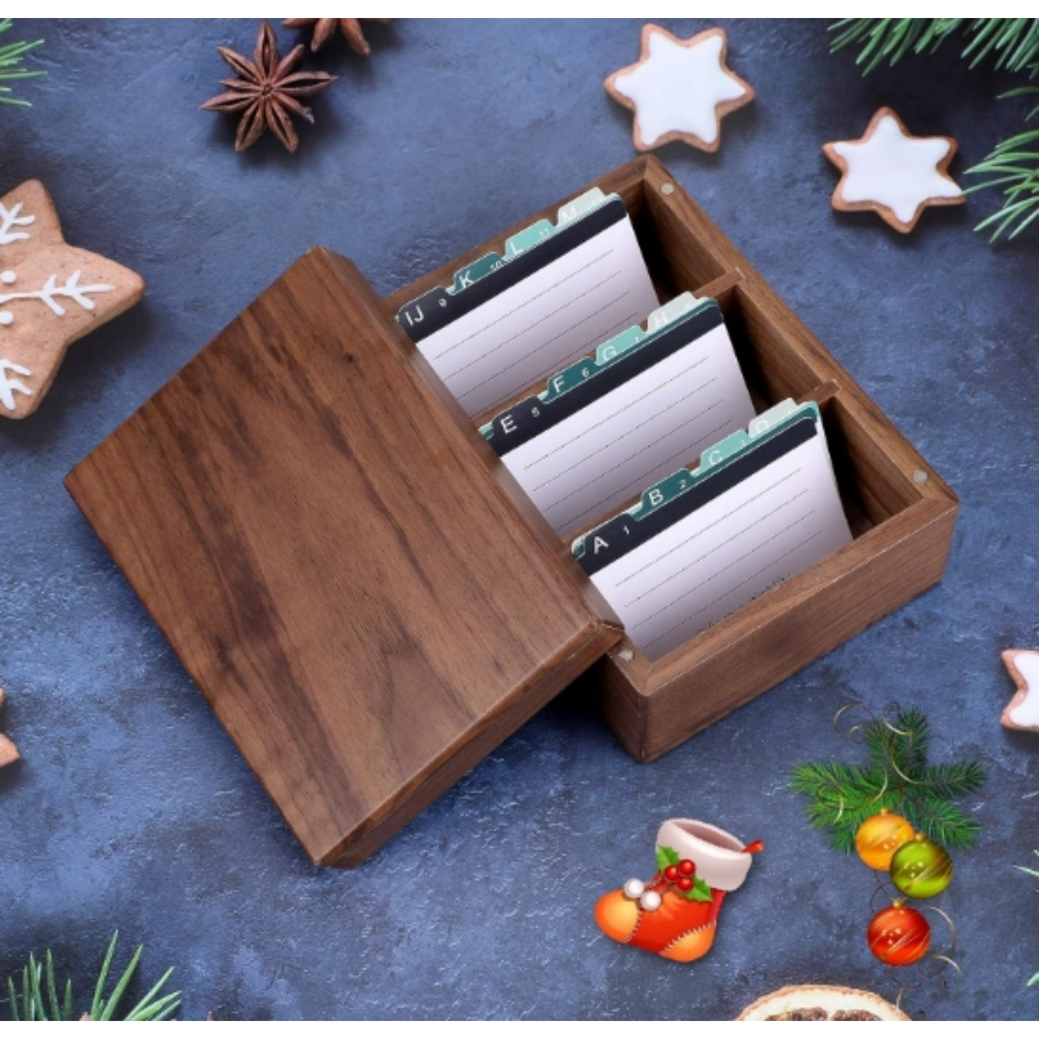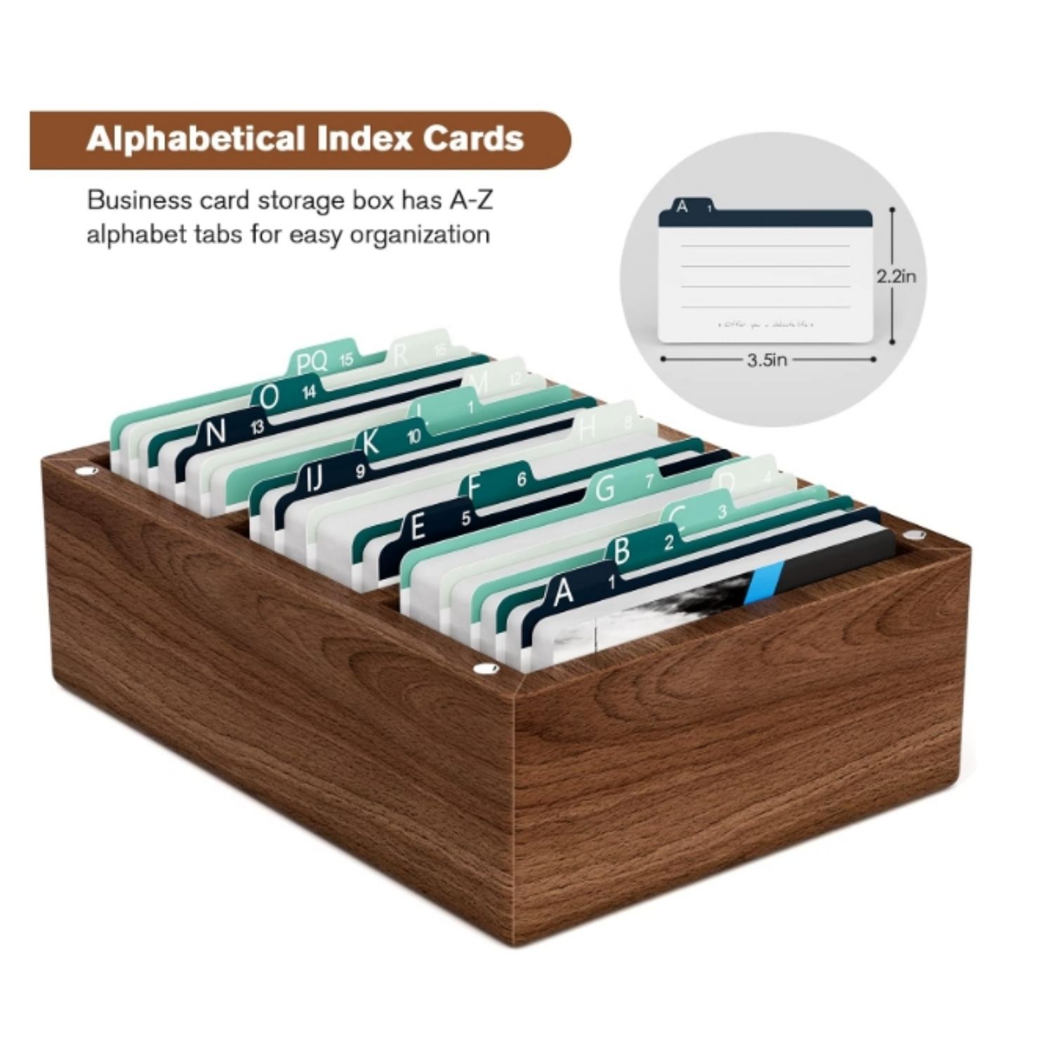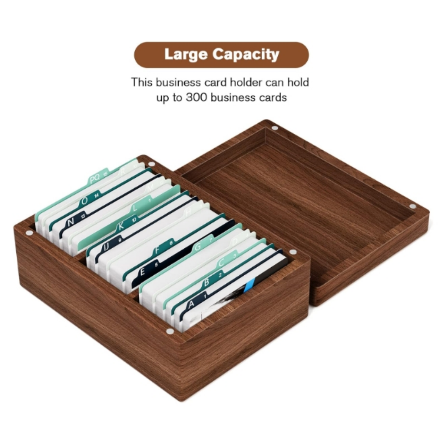 Business Card Holder for Desk, 2.2" x 3.5" Walnut Wood Business Card Organizer, Index Cards Box Holds 300 Cards, 3 Divider Boards