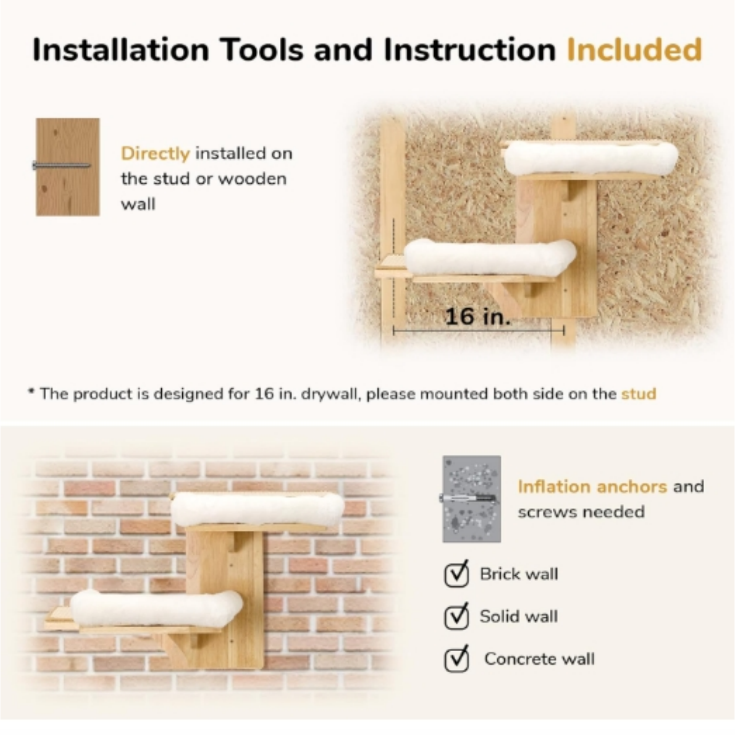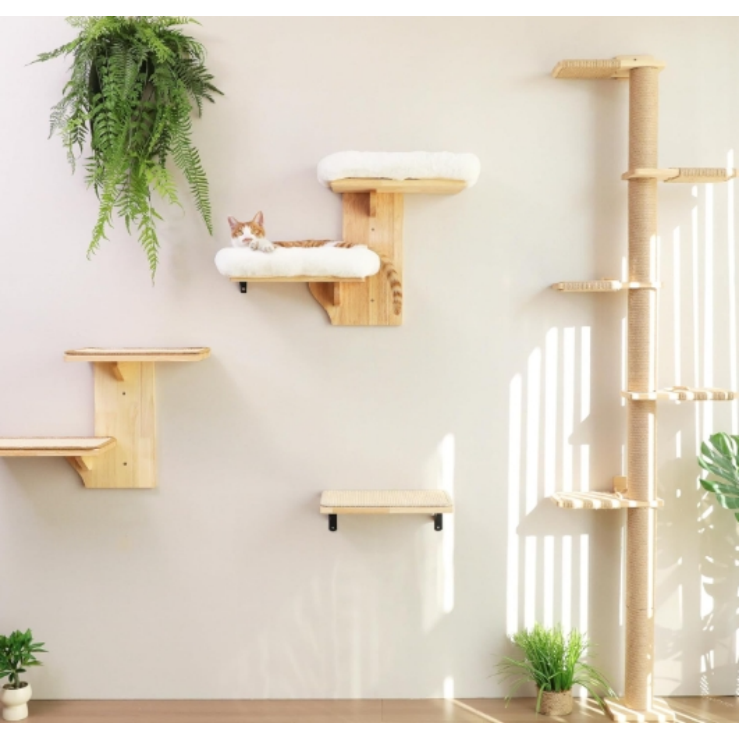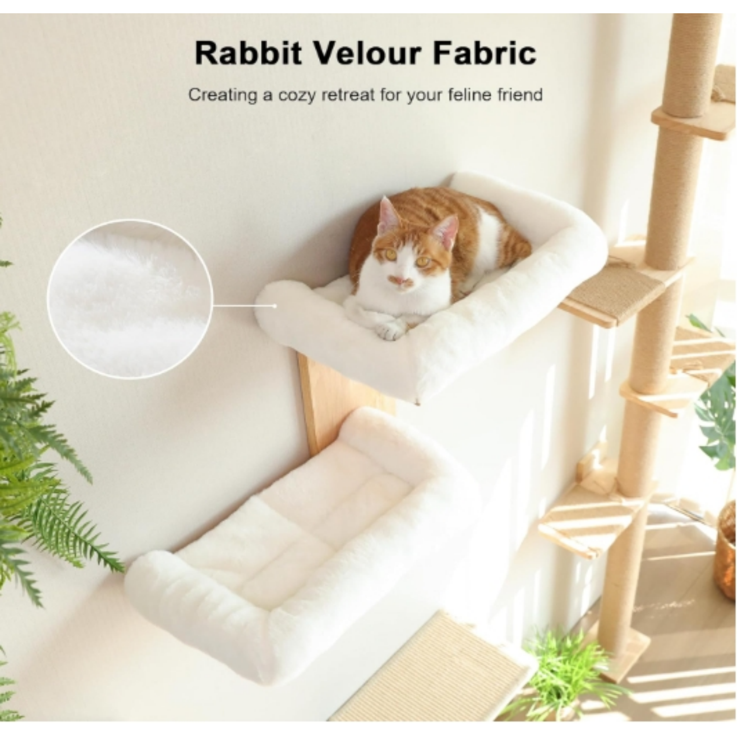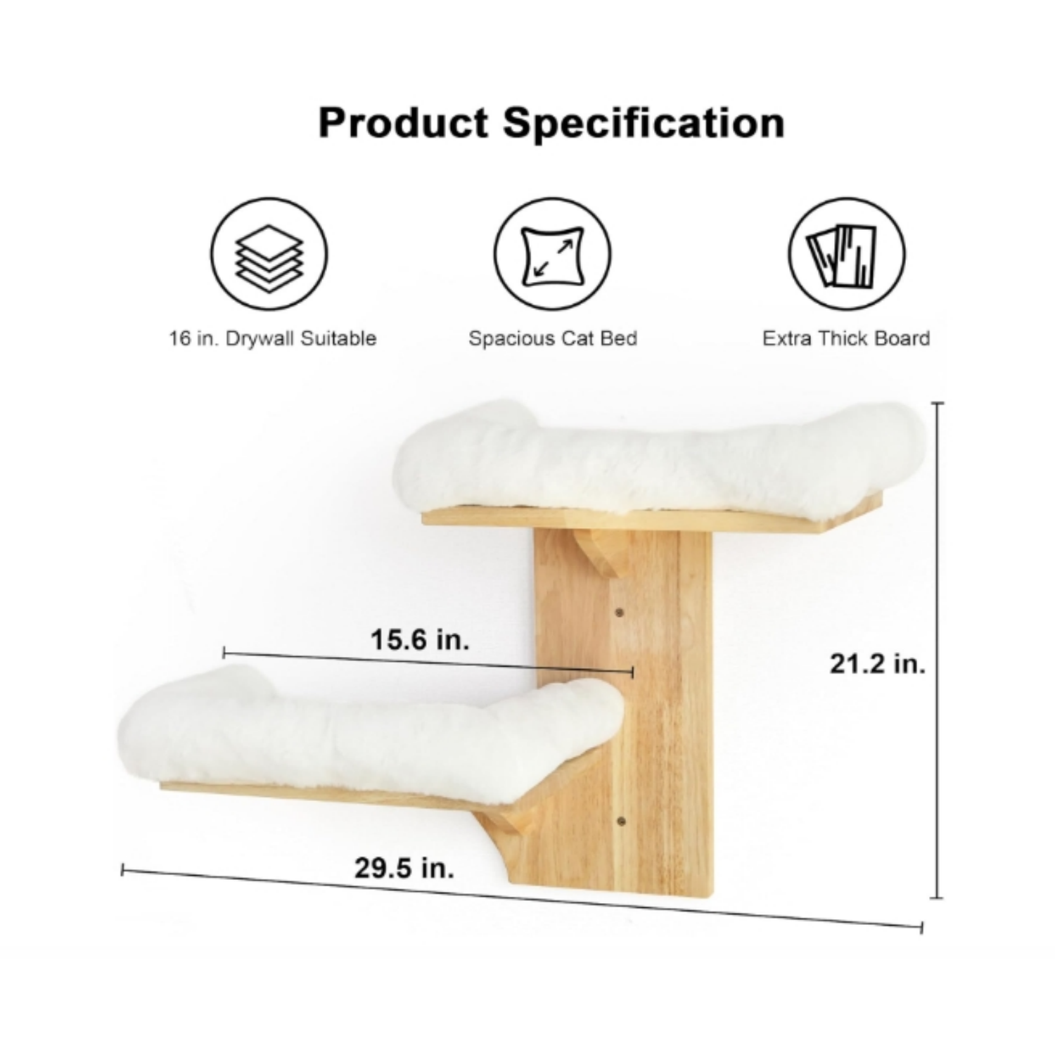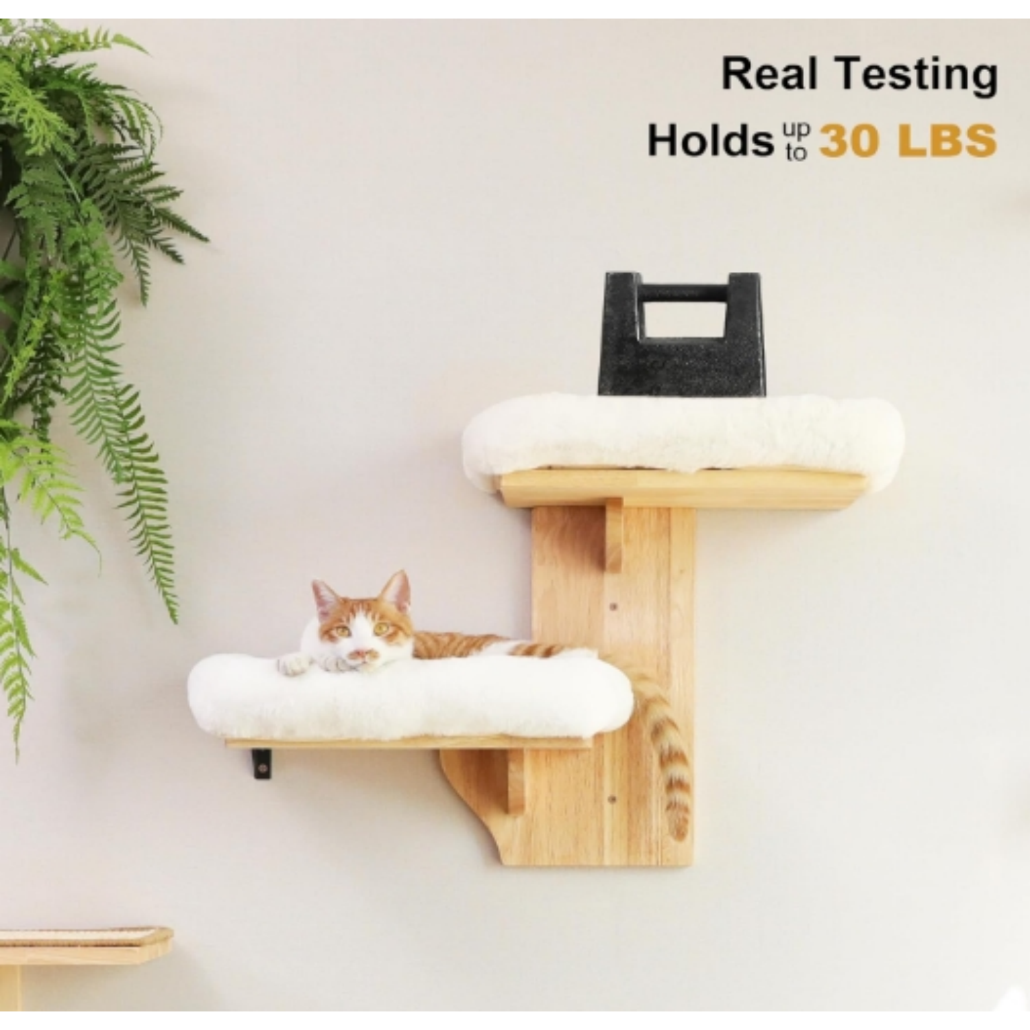 Crafted from solid rubber wood, these floating shelves are both sturdy and sustainable, ensuring long-lasting durability. The design features two spacious platforms, offering plenty of room for cats of all sizes to rest, climb, and play. Each platform comes equipped with soft cushions to create a cozy and comforting space that your cat will love to lounge on. The natural wood finish further emphasizes quality, blending seamlessly with modern, rustic, or minimalist interiors.