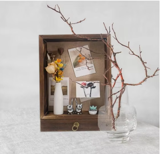Clear High Quality clear Shadow Box Frame with Drawer and Soft Line Back Wooden Display Case Memory Box