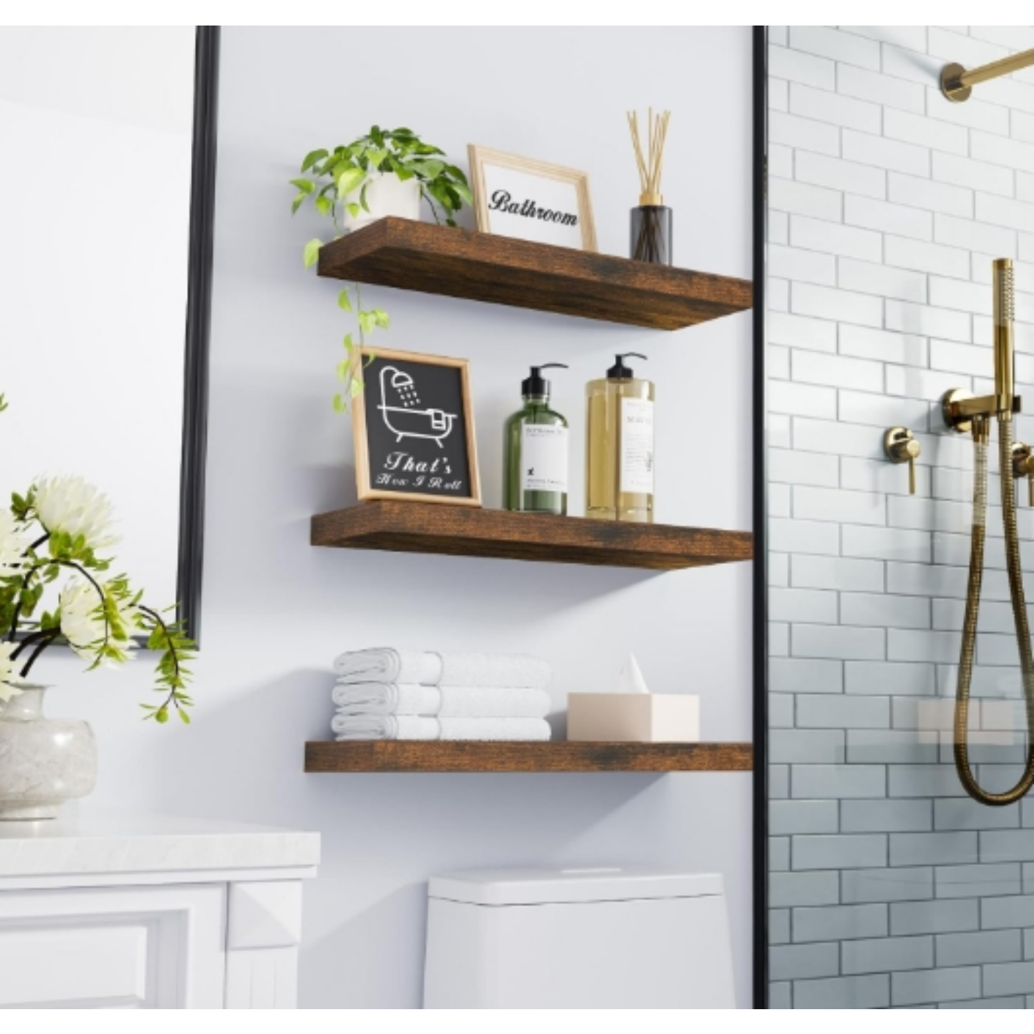 Transform any room in your home with these stylish and functional Floating Shelves Bathroom for Wall. Designed to bring charm and practicality, these rustic farmhouse shelves are perfect for adding storage space without taking up valuable floor area. Whether you need a sophisticated solution for organizing toiletries over your toilet, or a chic display area in your bedroom, kitchen, or living room, these shelves are the perfect addition to complement your interior design.