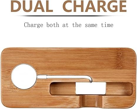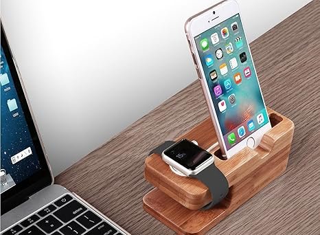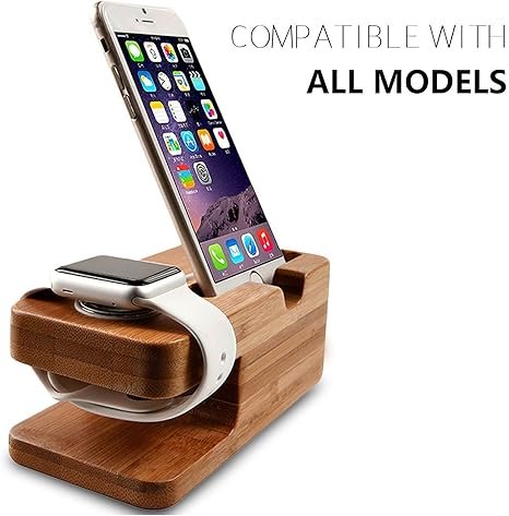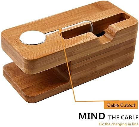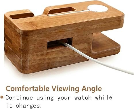 - Bamboo stand only, accessories NOT included. Made of Natural Bamboo, items will be in nature color. Keep your Apple Watch clean and secure while it charges with our Natural Bamboo Apple Watch Stand. Designed for compatibility with all Apple Watch and iPhone models, this elegant docking station allows your device’s inductive charger to slot in comfortably. Not only does it provide a stable charging platform, but it also doubles as a stylish clock to enhance your home or office decor. Made from solid, natural bamboo, each stand showcases its unique wood grain, ensuring a chic and classy look. Please note that this is a bamboo stand only; accessories are not included.