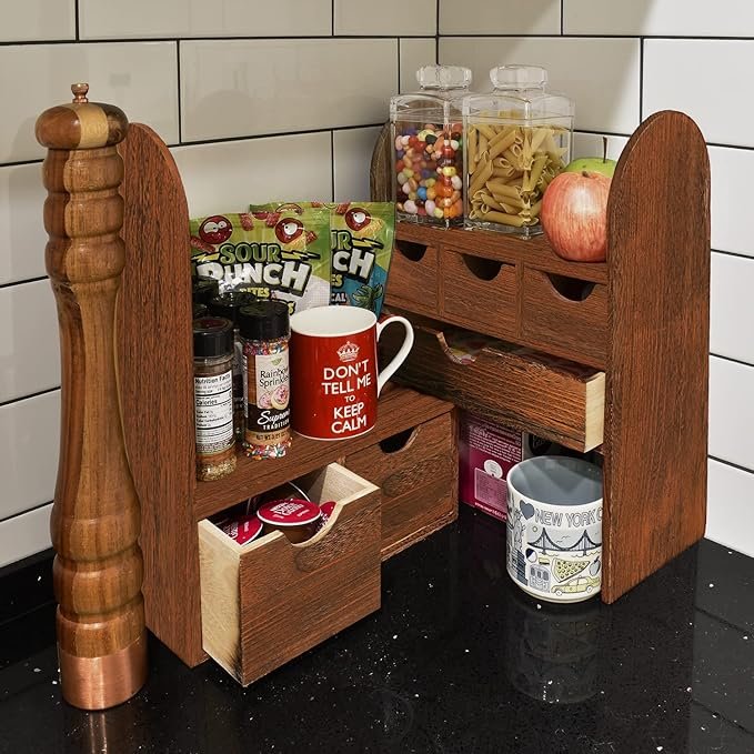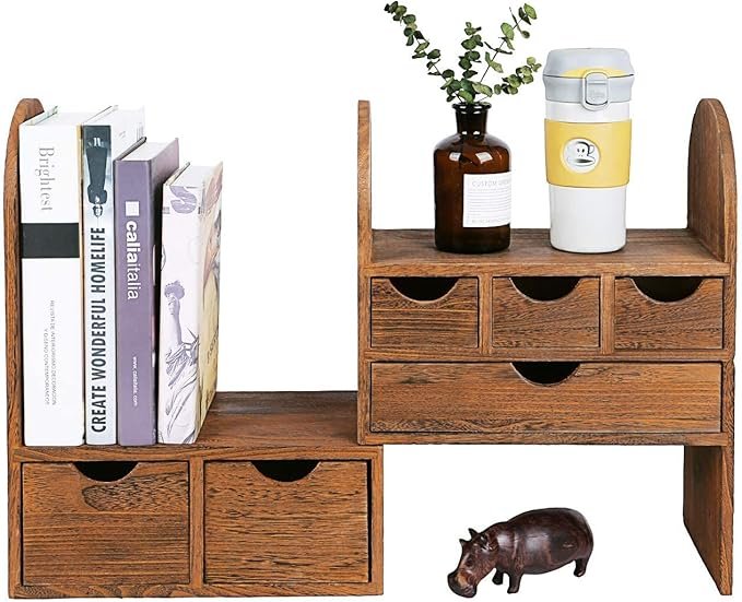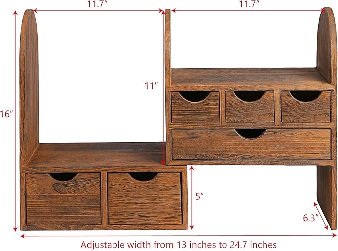 WOODEN DESKTOP STORAGE – This desktop bookcase is made of lightweight wood. DESKTOP ORGANIZER – It consists of two separate cases. You may extend length and setting the cases for more function according to your need or pull closer cases to save space. DESKTOP ORGANIZER – Ideal for storing office supplies, hand-hold electronic device, books, files, letters, and personal belongings. MATERIAL & SIZE – Wood, Overall: 13″W x 6.3″D x 16″H, Maximum pulled out length: 24.7″WIntroducing our Wooden Desktop Storage Organizer, a beautiful and functional addition to any workspace. Crafted from lightweight wood, this elegant bookcase features two separate cases that can be configured to fit your needs. Whether you want to extend the length for maximum storage or pull the cases closer together to save space, this organizer adapts seamlessly to your requirements. Perfect for housing office supplies, handheld electronic devices, books, files, letters, and personal belongings, it helps keep your desktop tidy and clutter-free. Elevate your workspace’s aesthetic with this chic and practical storage solution.