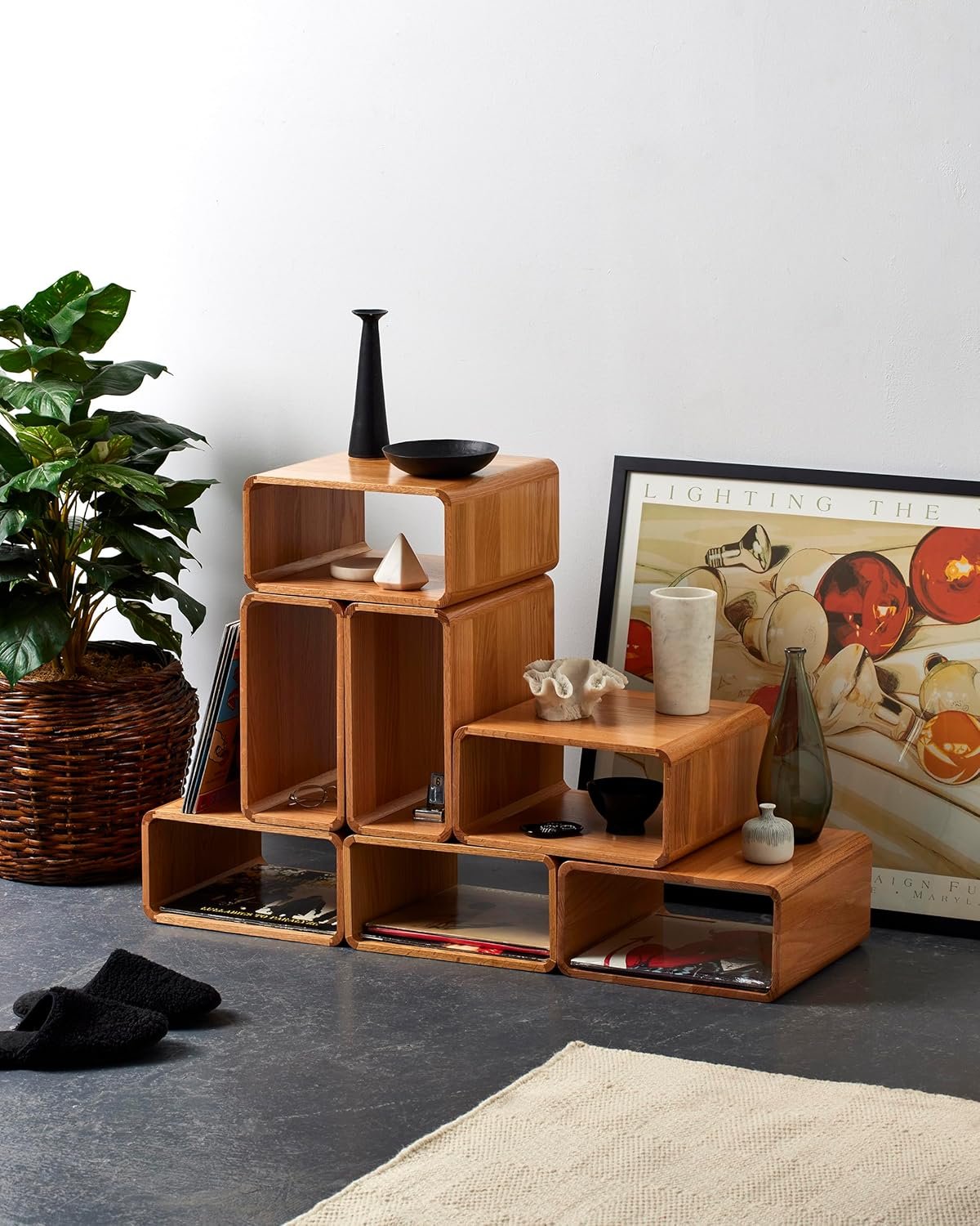 - Durable Oak Wooden Bookshelves: Made from 100% oak wood, this small bookshelf features a water-resistant and scratch-resistant finish, ensuring long-lasting reliability and a sleek, maintenance-free appearance. Discover the perfect addition to your home or office with our Versatile Oak Wooden Shelf. Designed for personalization, it serves as an elegant bookcase, stylish cube storage, or charming decorative shelves that elevate any room. Whether you need to organize books, showcase decor, or keep essentials within reach, this multi-purpose small bookshelf fits the bill. Featuring a contemporary design that seamlessly integrates into your bedroom, living room, or workspace, it allows for endless stacking arrangements without the hassle of assembly—just unbox and beautifully arrange your space. Crafted from 100% oak wood, our bookshelf boasts a durable, water-resistant, and scratch-resistant finish, ensuring both functionality and a maintenance-free aesthetic that will last for years.