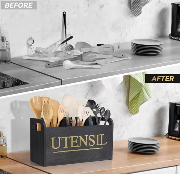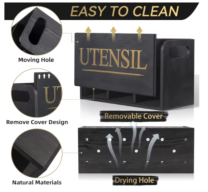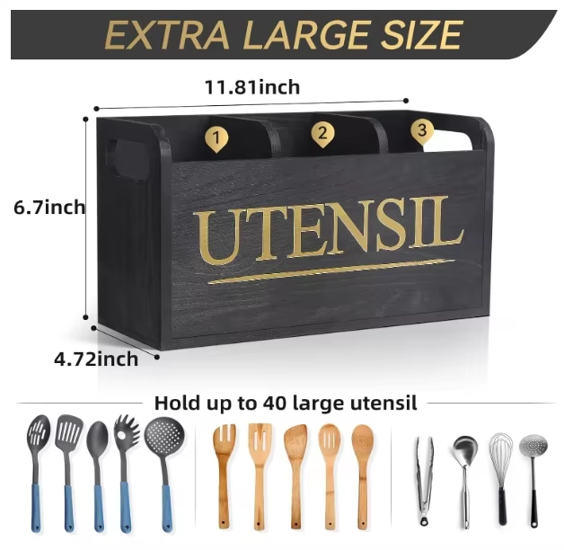 Party Decoration Black Wooden Kitchen Utensil Holder with 3 Compartment Larger Utensil Holder for Kitchen Counter