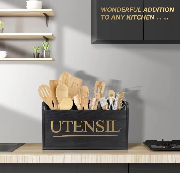 Elevate your kitchen decor with our Party Decoration Black Wooden Kitchen Utensil Holder. Designed with three spacious compartments, this larger utensil holder provides ample storage for your kitchen tools while keeping them within easy reach. The sleek black wood finish adds a touch of sophistication to your countertop, making it not only a functional piece but also a stylish addition to your kitchen decor. Perfect for entertaining or everyday use, this utensil holder combines practicality with elegance.