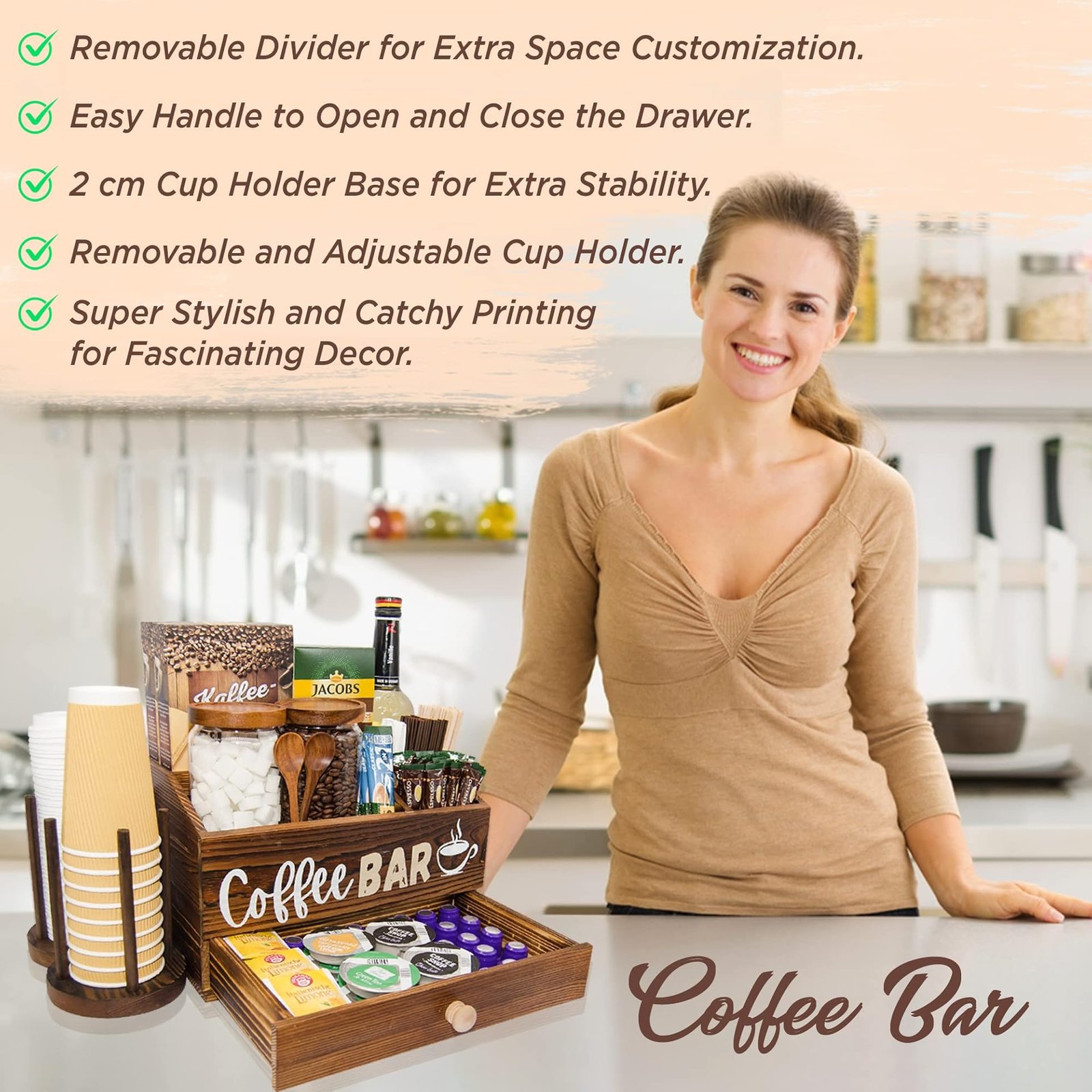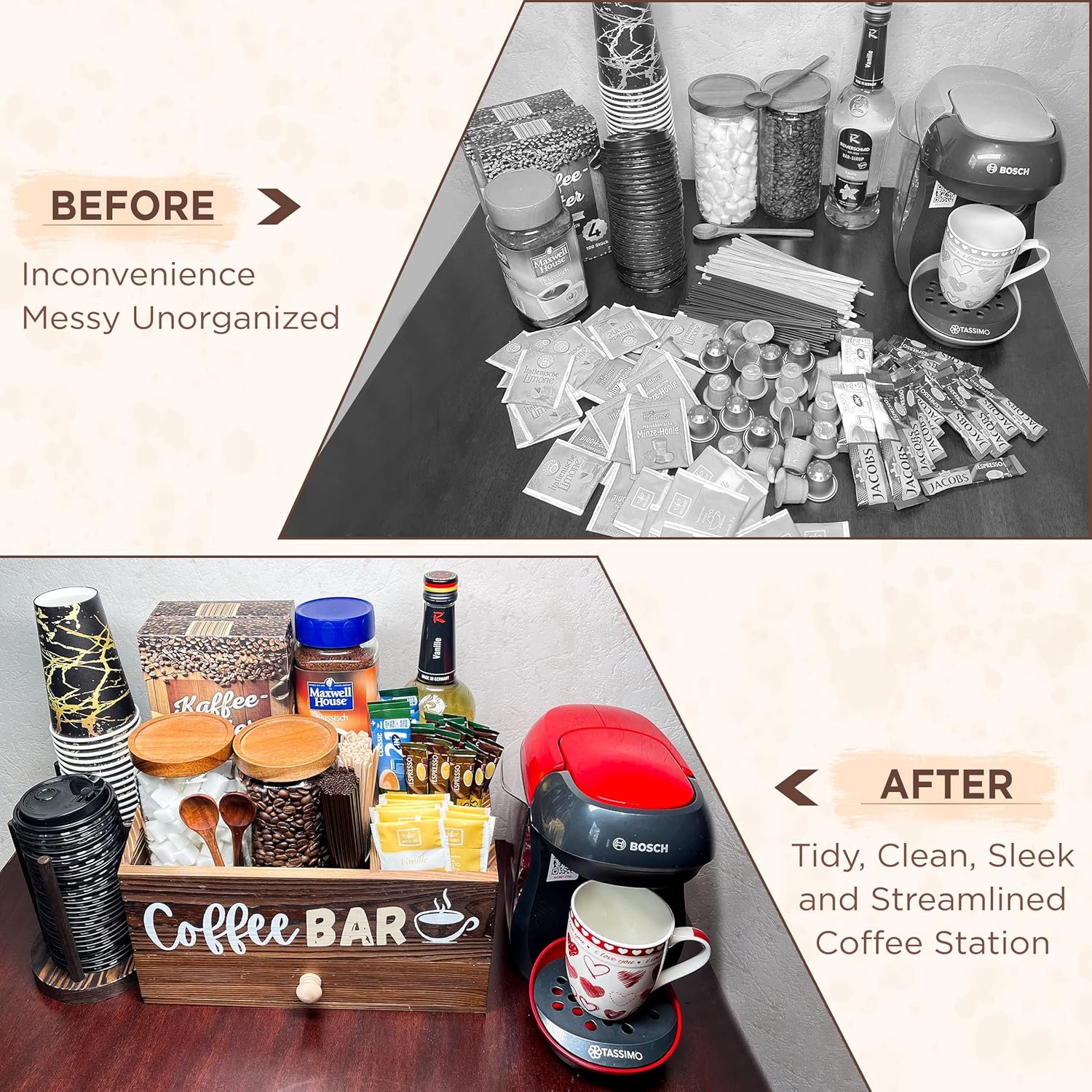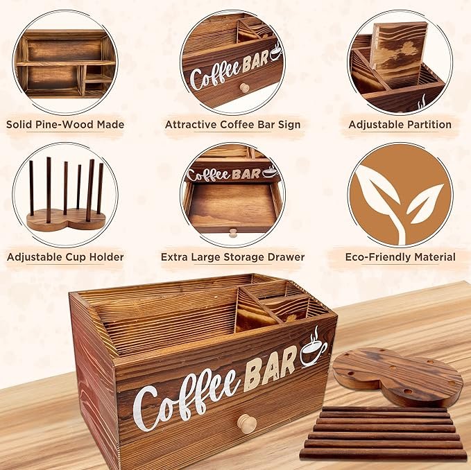 - [ OPTIMIZED DESIGN ] Capacity Like no Other !! With different size slots, Adjustable Cup holder, and Wide drawer, all coffee accessories have a suitable space to store. It is designed to save space and optimize the capacity of stored bottles, creamers, syrups, sweeteners, stir sticks, tea bags, napkins, and more. It is upgraded with an easy close and open drawer to feature storing additional coffee pods or napkins in the same coffee bar area without using extra side space. This coffee station organizer fulfills all the needs besides the coffee machine.