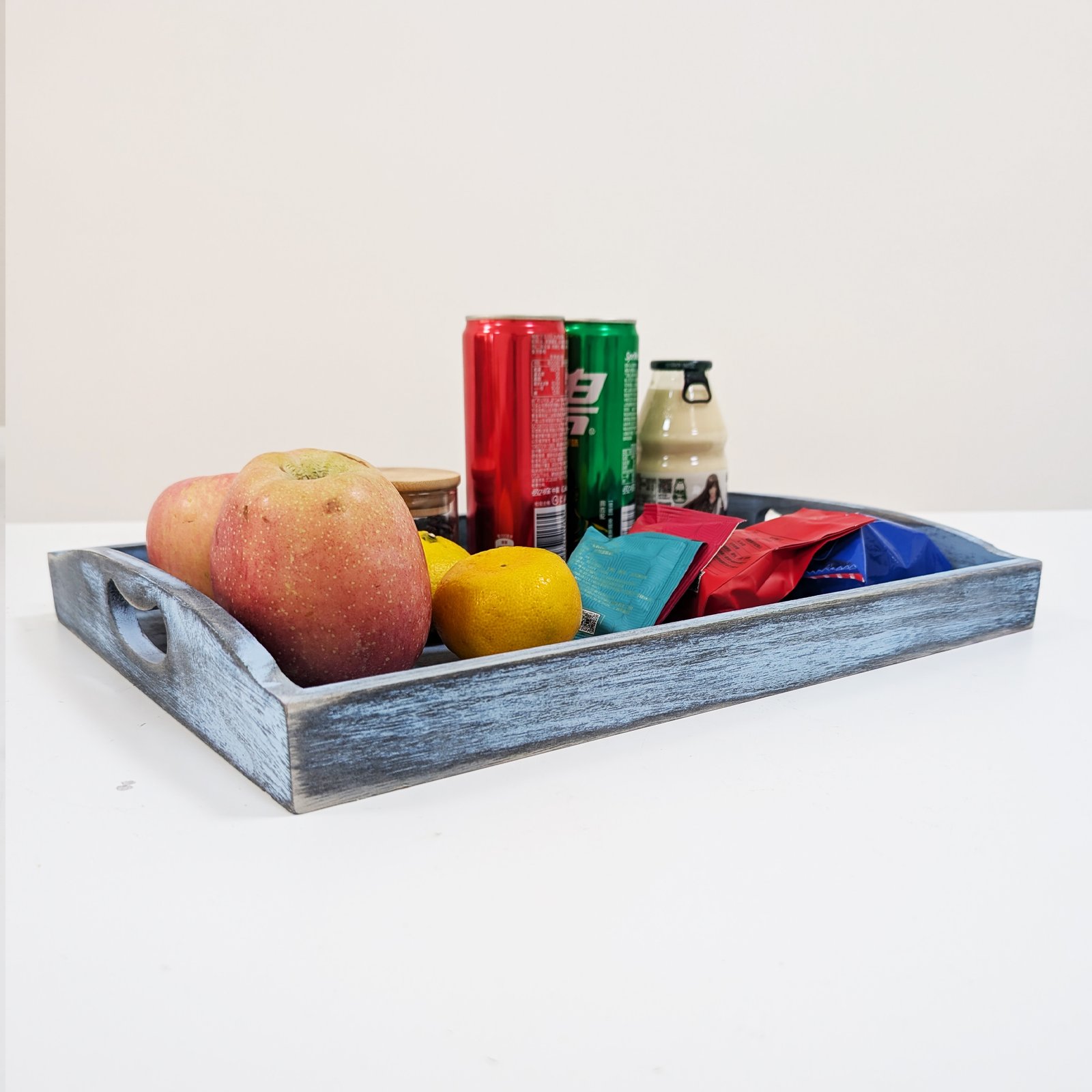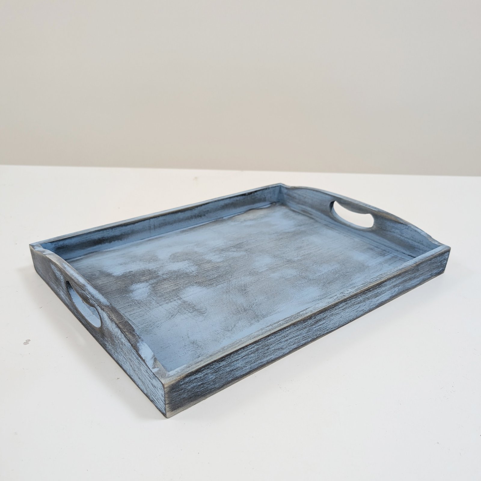 • Farmhouse-Inspired Wooden Serving Tray: These vintage blue table trays decorative designs add a touch of rustic charm to any setting, making them ideal wooden trays for food or as an eye-catching ottoman tray centerpiece.