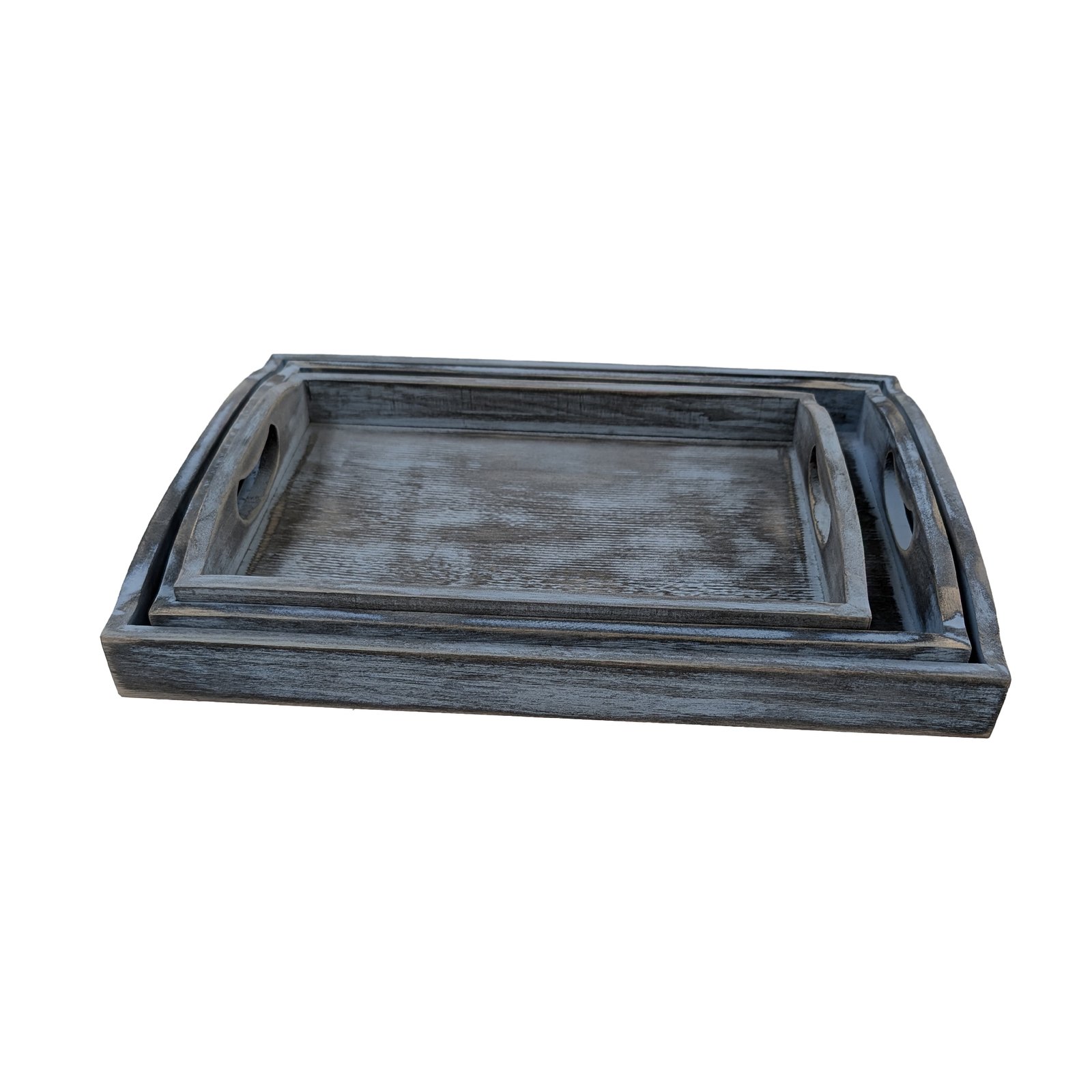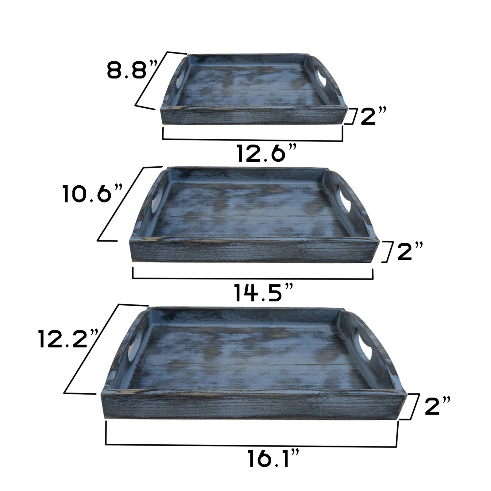 Elevate your hosting experience with our Rustic Vintage Wood Serving Tray Set, featuring three sizes – small, medium, and large. Crafted with a charming farmhouse-inspired design, these trays are perfect for both decorative and functional use. Serve snacks, drinks, or use them as a stunning centerpiece on your coffee table. With sturdy handles for easy carrying, this set offers flexibility and style, making it ideal for entertaining or enhancing your kitchen decor. Transform any gathering into a memorable occasion with these beautifully designed wooden trays.Elevate your serving experience with our Rustic Vintage Wooden Serving Tray Set, featuring small, medium, and large trays designed for ultimate versatility. Perfect as a chic decorative piece on your coffee table or as functional serving trays with handles for tea and snacks, these farmhouse-inspired blue wooden trays bring a touch of rustic charm to any setting. Whether you’re looking to create an inviting coffee bar or need smaller trays for kitchen counter decor, this set has you covered. Each tray is designed with sturdy handles for easy serving, making them not only stylish but also practical for enhancing your charcuterie board presentations and impressing your guests effortlessly.Elevate your serving experience with our Rustic Vintage Wood Serving Tray Set, which includes small, medium, and large trays designed for versatility and style. Perfect for use as decorative pieces on your coffee table or functional serving trays with convenient handles, these farmhouse-inspired trays add a touch of rustic charm to any setting. Whether you’re creating an inviting coffee bar, showcasing a stunning charcuterie board, or looking for smaller trays for kitchen counter decor, this set provides endless possibilities. Each tray is crafted with sturdy handles, ensuring that practicality meets elegance in your entertaining endeavors.