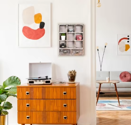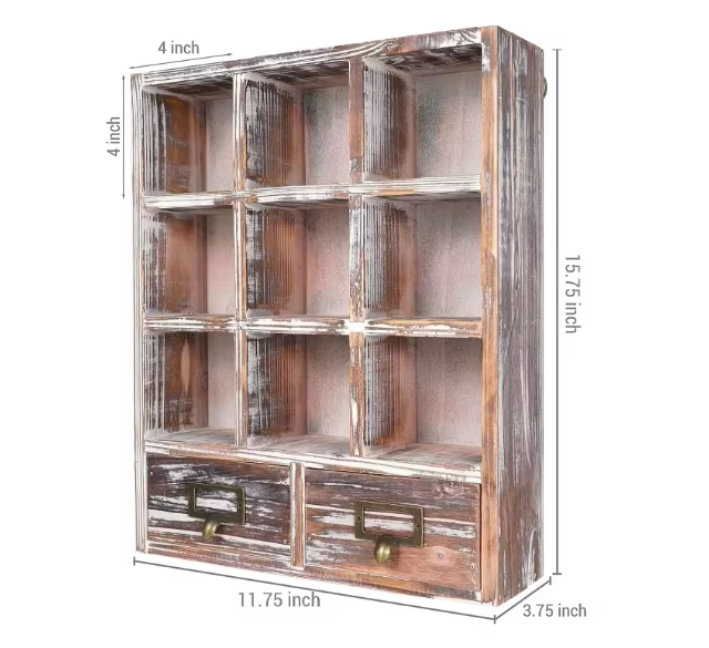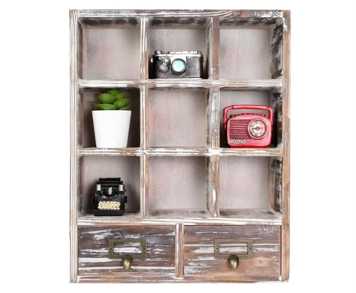 Rustic Wood Shadow Box Shelf, warm brown finish, home aesthetic, table top display organizer, collectibles, photographs, decorations, pull-out drawers, storage space, small items, organized, clutter-free, living rooms, bedrooms, rustic charm