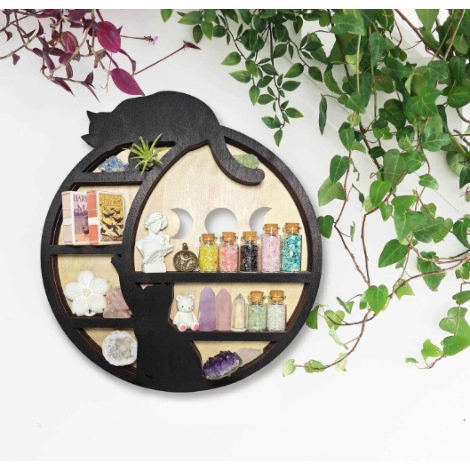 Whether you're a collector of stones, a fan of essential oils, or someone who loves organizing displays, this shelf serves as an ideal storage companion. The carefully designed compartments allow you to neatly arrange crystals, rocks, oils, and other small treasures. Its unique crescent moon shape also doubles as a decorative piece, ensuring your most cherished possessions are beautifully showcased.