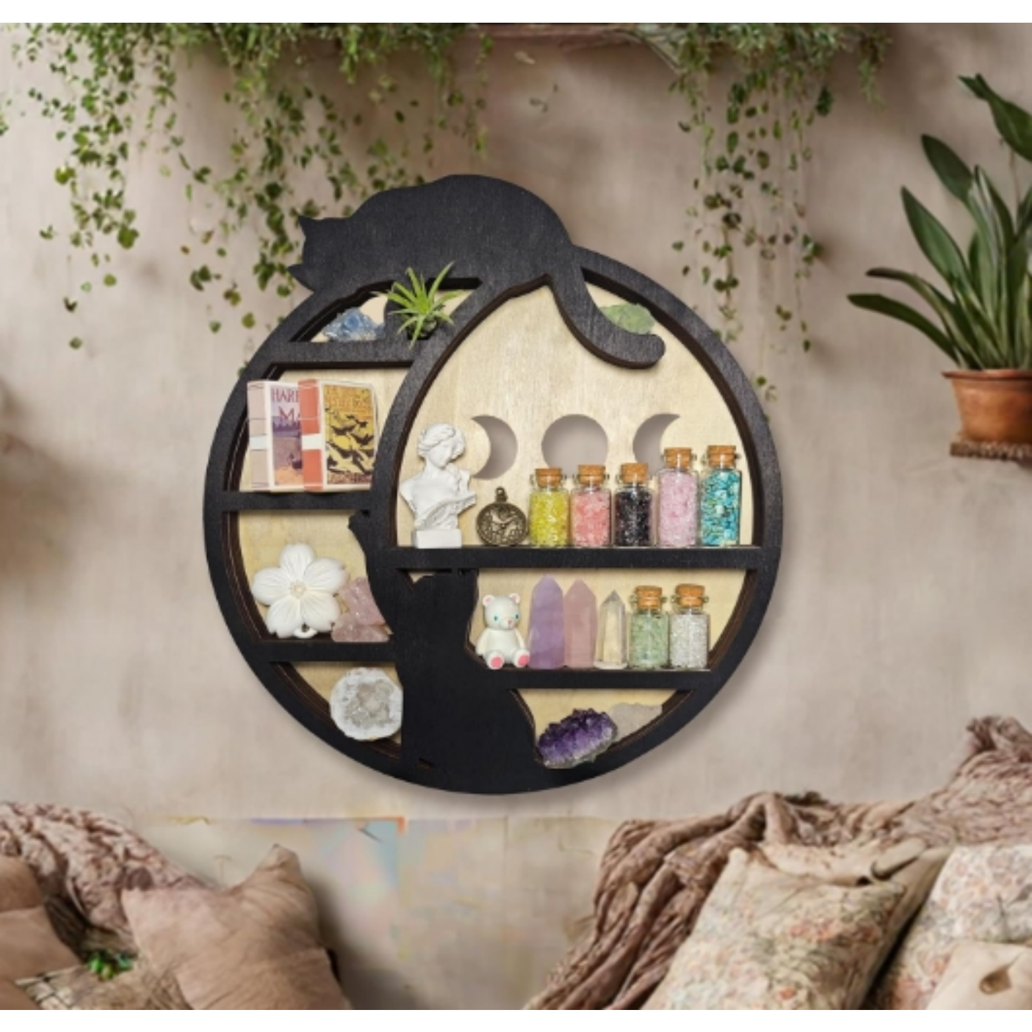 Designed to accommodate various interior styles, the Moon Crystal Display Shelf complements minimalistic, bohemian, and contemporary décor alike. Hang it on any wall to instantly elevate your space while maintaining functionality. Its wooden charm invites warmth and balance, making this organizer an appealing addition to any setting.
