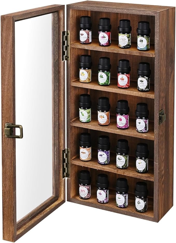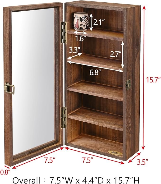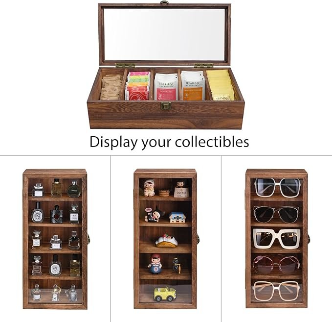 - MULTIFUNCTIONAL WOODEN DISPLAY CASE – Made of sturdy wood with a brown color finish. Take your keepsakes out of storage and display them in this rustic wood shelf. Brighten up your collection display perfectly. Ideal as a wood tea bag organizer or coffee and tea organizer.