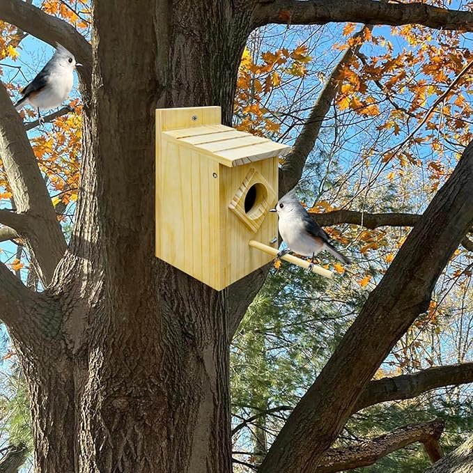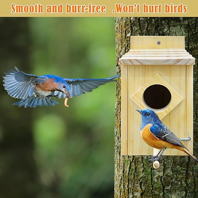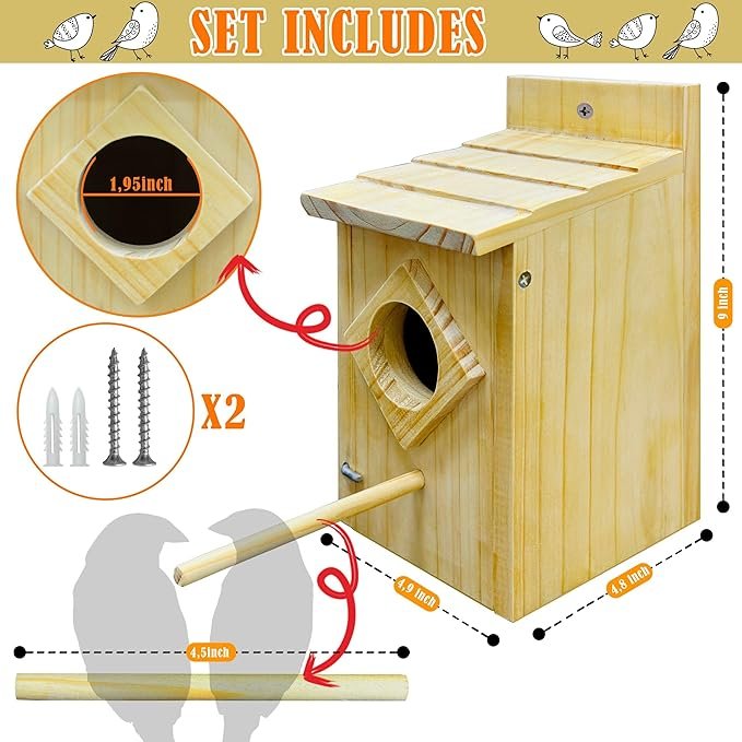 - 𓅪 ELEGANT DESIGN𓅪 The 2-inch-diameter birdhouse entrance can draw bluebirds, wrens, tree swallows, and chickadees. It’s a terrific present for birdwatchers or nature lovers, featuring a rod-shaped design that birds may stand on. Introducing our All-In-One Birdhouse, designed for convenience and durability. This birdhouse comes in a one-piece box, eliminating the hassle of assembly. Its waterproof treatment ensures the painted surface resists weather damage while maintaining functionality outside. Crafted with high-temperature carbonization, the hardwood surface withstands the elements with ease, making it ideal for outdoor use. Cleaning and filling are a breeze, thanks to the front door that opens for easy access. With a charming 2-inch entrance, this elegant birdhouse attracts bluebirds, wrens, tree swallows, and chickadees, making it a perfect gift for birdwatchers and nature enthusiasts alike. Enhance your garden with this sturdy and stylish abode for your feathered companions.